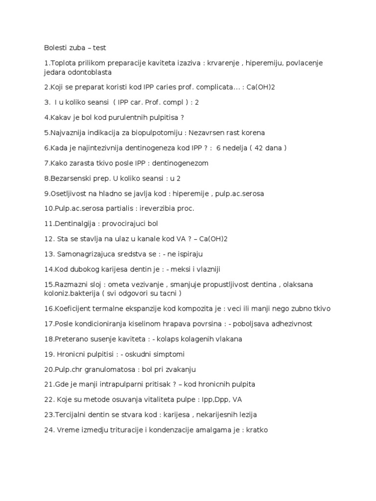Semestru i odnosi se na oblast preparacije kaviteta. Save ispitna pitanja iz predmeta bolesti zuba sa endodoncijom for later. Usmeni deo se sastoji od odgovora na ispitna pitanja iz gradiva predviđenog nastavnim planom i programom za ovaj predmet. Iz čega je izgrađena zubna pulpa ?