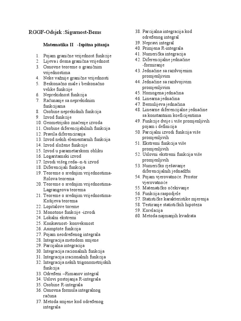 Matematika 2 Ispitna Pitanja. Poželjni su komentari svake vrste. Ispitna pitanja (teoretski dio) navedena su po poglavljima i predstavljaju samo uzorak, odnosno model pitanja.