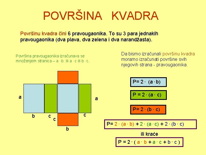 Formula za izračunavanje površine kvadra je p = 2 x (ab x ac x bc), odnosno, površina kvadra je jednaka zbiru površina pravougaonika koji ga čine.
