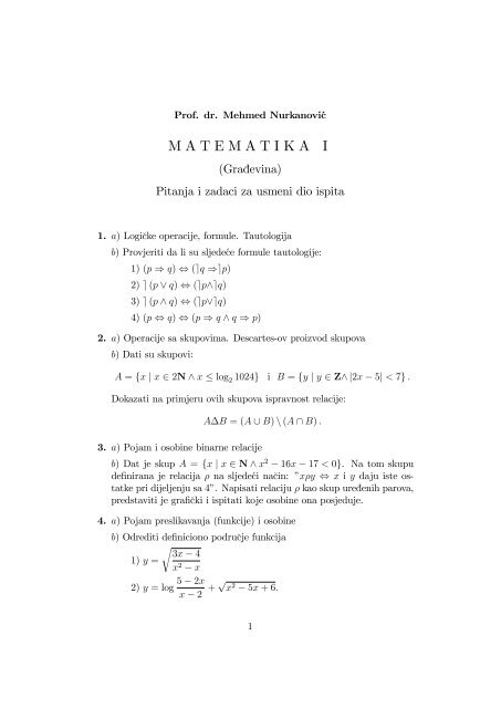 Text of www2 pitanja matematika ii. Pitanja (73 79) iz oblasti predvienih za obradu kroz seminarske radove studenata : U utorak u prijepodnevnim satima na stranici kolegija bit će objavljena ogledna zadaća za mi. Matematika 2 održavat će se u utorak i u srijedu.