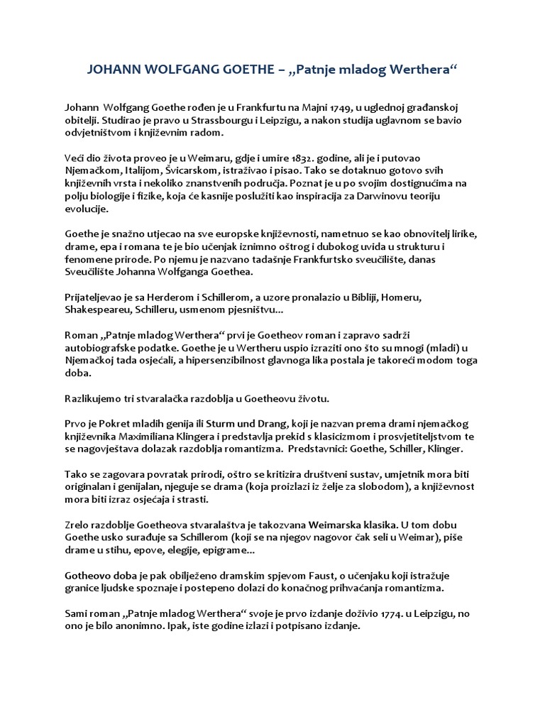 Prvi veliki popularni uspjeh goetheove karijere bila je objava romana patnje mladog werthera, sentimentalni i psihološki roman u obliku. Sve to sam mogao pronai o povijesti bijednoga werthera pokupio sam brino i evo pred vas stavljam, i. Ovaj poetični roman pripada razdoblju predromantizma i jedan od najpoznatijih romana ove vrste svih vremena. Barem nije više spominjao werthera u.