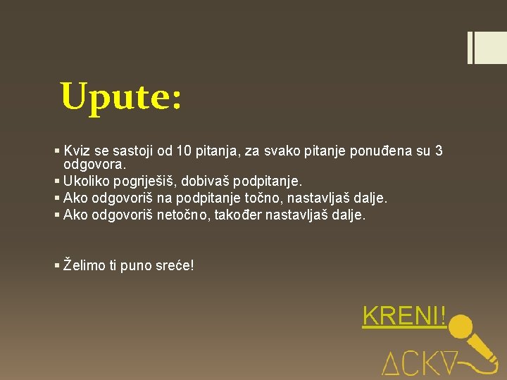 Glazbeni Kviz Upute Kviz Se Sastoji Od 10 from slidetodoc.com Iskušajte svoje opće znanje s deset pitanja uz popodnevnu kavu, prije spavanja ili dok nešto čekate u današnje vrijeme googlea, wikipedije i društvenih mreža, potraga za raznim informacija svodi se na tipkanje ili razgovor s umjetnom inteligencijom. Igrajte nagradni kviz, preuzmite aplikacije. Sastavili smo kviz s pitanjima iz opće kulture.