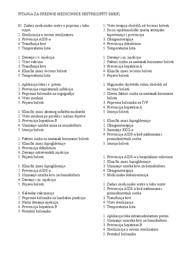Ispitna Pitanja Za Medicinsku Sestru. Ispit za medicinsku sestru ima između 75 i 265 pitanja, a praktični ispit između 85 i 205 pitanja. Služba za radiološku dijagnostiku, ultrazvuk i ct.