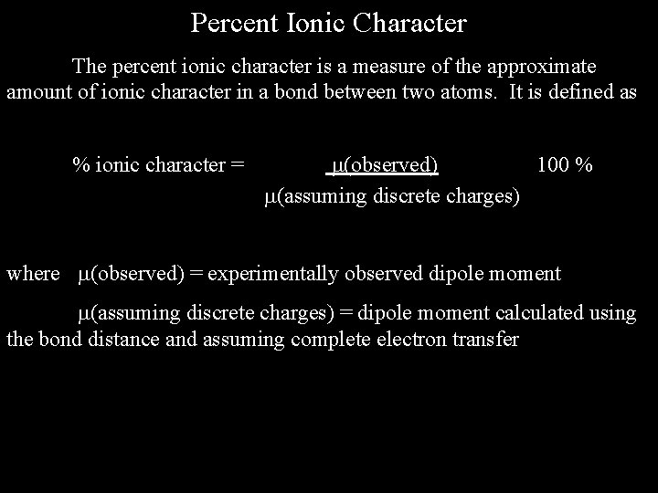 Formula To Calculate Percentage Of Ionic Character. Now, you can calculate the percent ionic character given the experimentally determined dipole moment and the dipole moment if the bond were perfectly ionic. You can determine the ionic character by caunting the percent ionic character formula.