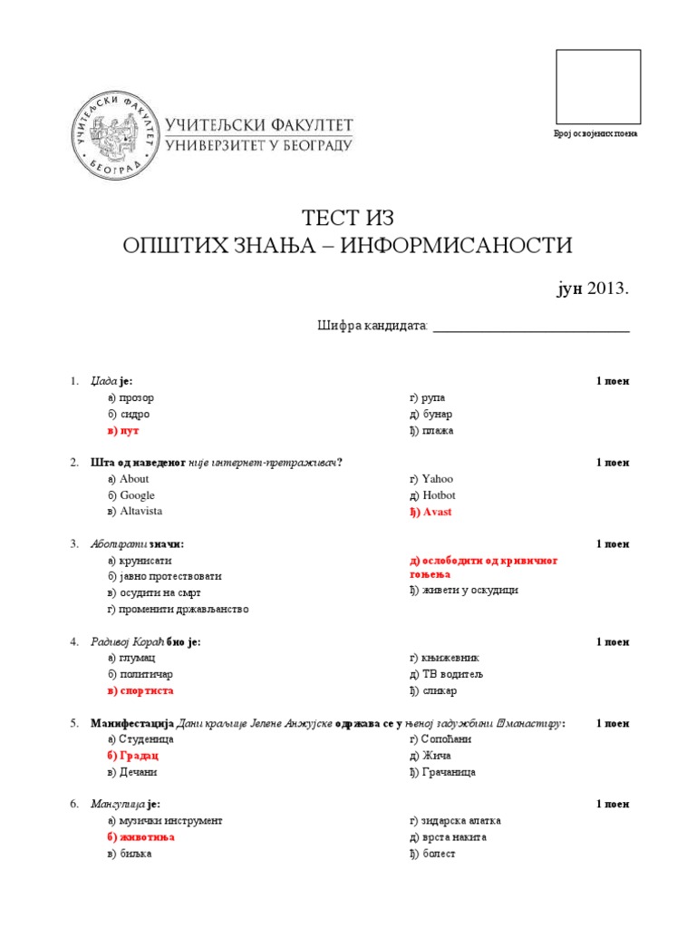 Pdf Nacionalno Testiranje Obrazovnih Postignuca Ucenika Iii Razreda Osnovne Skole from i1.rgstatic.net Da li je taj epitet opravdan ili ne, saznaće svi oni koji ga budu rešavali sutra na tom fakultetu. Видео test opste informisanosti #2 канала veliki musha. Test opste informisanosti (toi) je vrsta testa sastavljen od niza pitanja kojima se ispituje vrlo siroko znanje ispitanika iz raznih oblasti (kulture, politike, religije, sporta, knjizevnosti, nauke i tehnike itd).